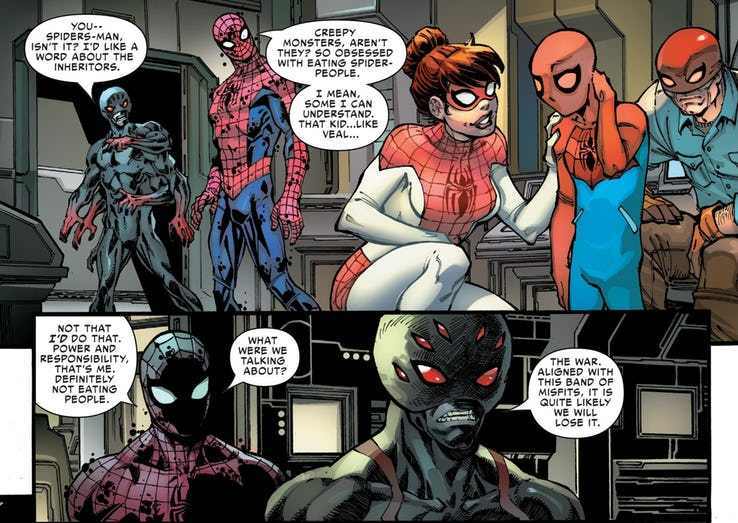La particolarità di questo evento, che forse potrebbe far storcere il naso a qualche fan, è che lo Spider-Man ufficiale di Terra-616 stavolta ha un ruolo molto marginale, in quanto il suo scontro con Morlun viene “delegato” alla testata Peter Parker: The Spectacular Spider-Man, mentre viene dato maggior risalto al machiavellico Superior Spider-Man, tra l’altro l’unico ad essere privo di poteri ragneschi, e ad altri Spider-Men più “modaioli” come Miles Morales, protagonista del succitato Spider-Man: Un nuovo universo, e lo Spider-Man del fortunato videogioco per PS4 Marvel’s Spider-Man, recentemente uscito.