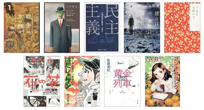 Le opere disponibili gratuitamente comprendono tutti i volumi dell’adattamento manga di Keito Koume del libro di storia The Unwomanly Face of War di Svetlana Alexievich, i primi quattro volumi del manga Barefoot Gen di Keiji Nakazawa, tutti i volumi del manga Ishi no Hana di Hisashi Sakaguchi, Il manga Il diario di Anna Frank di You Shiina, il romanzo 1984 di George Orwell, il romanzo Ōgon Ressha di Aki Satō, il romanzo Karera wa Sekai ni Hanarebanare ni Tatteiru di Ai Ota, il libro per bambini Taiyō no Ko di Kenjiro Haitani e il libro Democracy del MEXT.