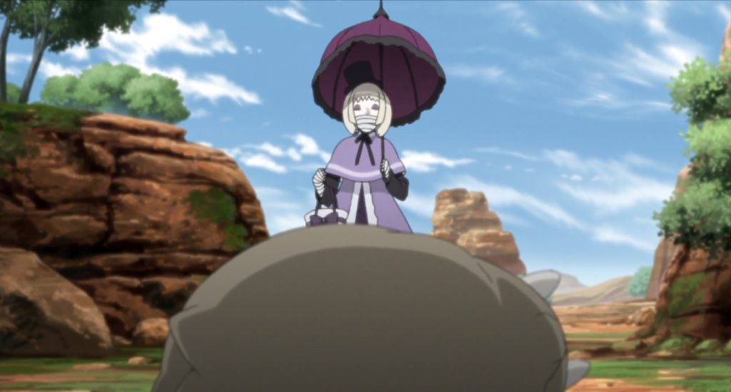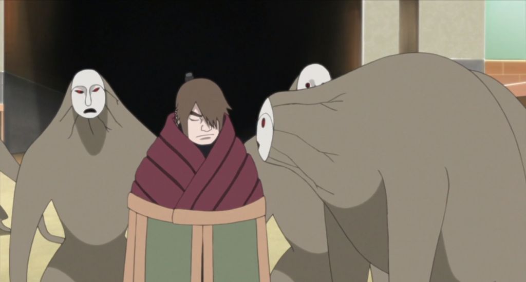 Una delle quattro creature agli ordini diretti di Kuu è giunta nel posto in cui si rifugiano Inojin e Akkun nel momento peggiore, quando il piccolo Genin è da solo.