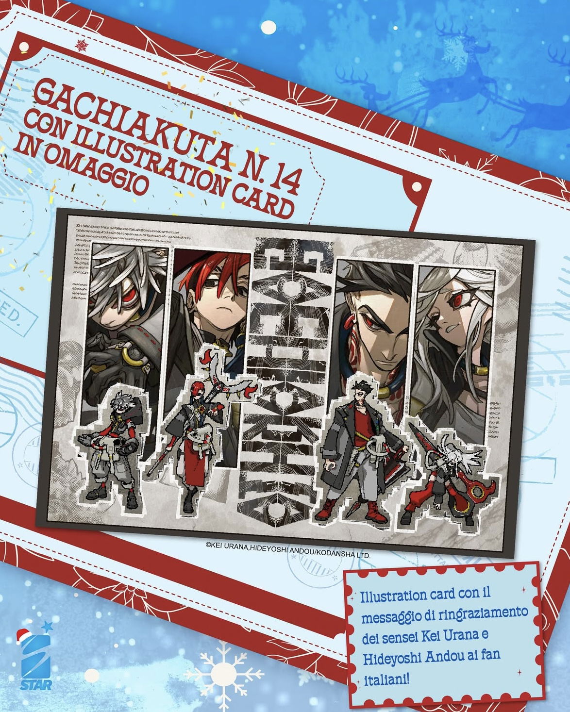 La prima edizione sarà quella classica, senza gadget, perfetta per chi desidera semplicemente proseguire la storia. Ma la vera chicca è la Limited Edition, a tiratura limitata, che includerà una illustration card esclusiva realizzata da Kei Urana e Hideyoshi Andou. L’immagine è un ringraziamento speciale dedicato ai fan italiani, un gesto che mostra ancora una volta quanto gli autori siano legati al pubblico del nostro Paese e quanto apprezzino l’affetto ricevuto fin dall’uscita dei primi volumi.