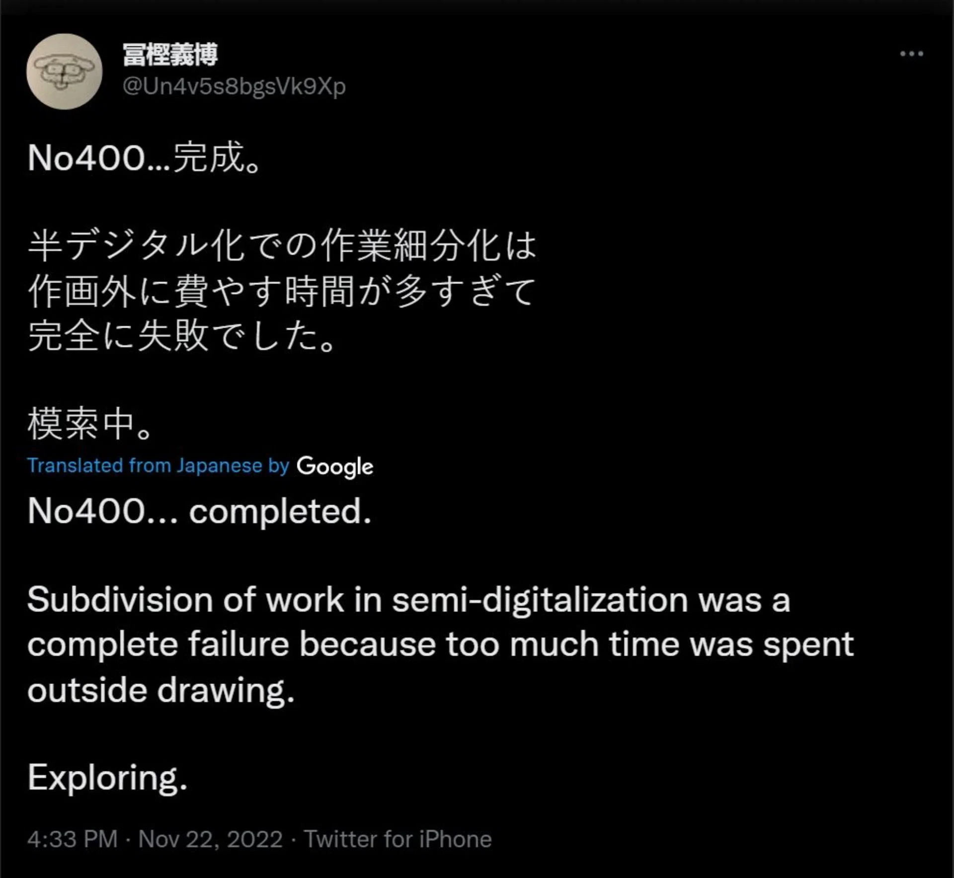 Il Tweet visionabile in calce dichiara: “Stavo testando nuove tecniche per il capitolo 400, e devo dire che questa semi-digitalizzazione è un completo fallimento. Sostanzialmente è solo del lavoro in più, visto che oltre il lavoro classico devo aggiungere anche questo. Sicuramente va a interferire sul tempo già stretti della normale serializzazione”.