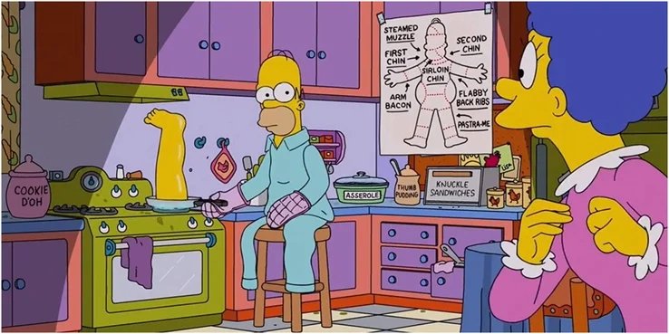 L’odissea auto-cannibalistica di Homer inizia per caso, con un dito tagliato che finisce accidentalmente sulla griglia. Così, un pezzo per volta, Homer divora se stesso, causando la sua morte prematura, con conseguente visitina a Gesù in Paradiso. “Mmm, qualcosa“.