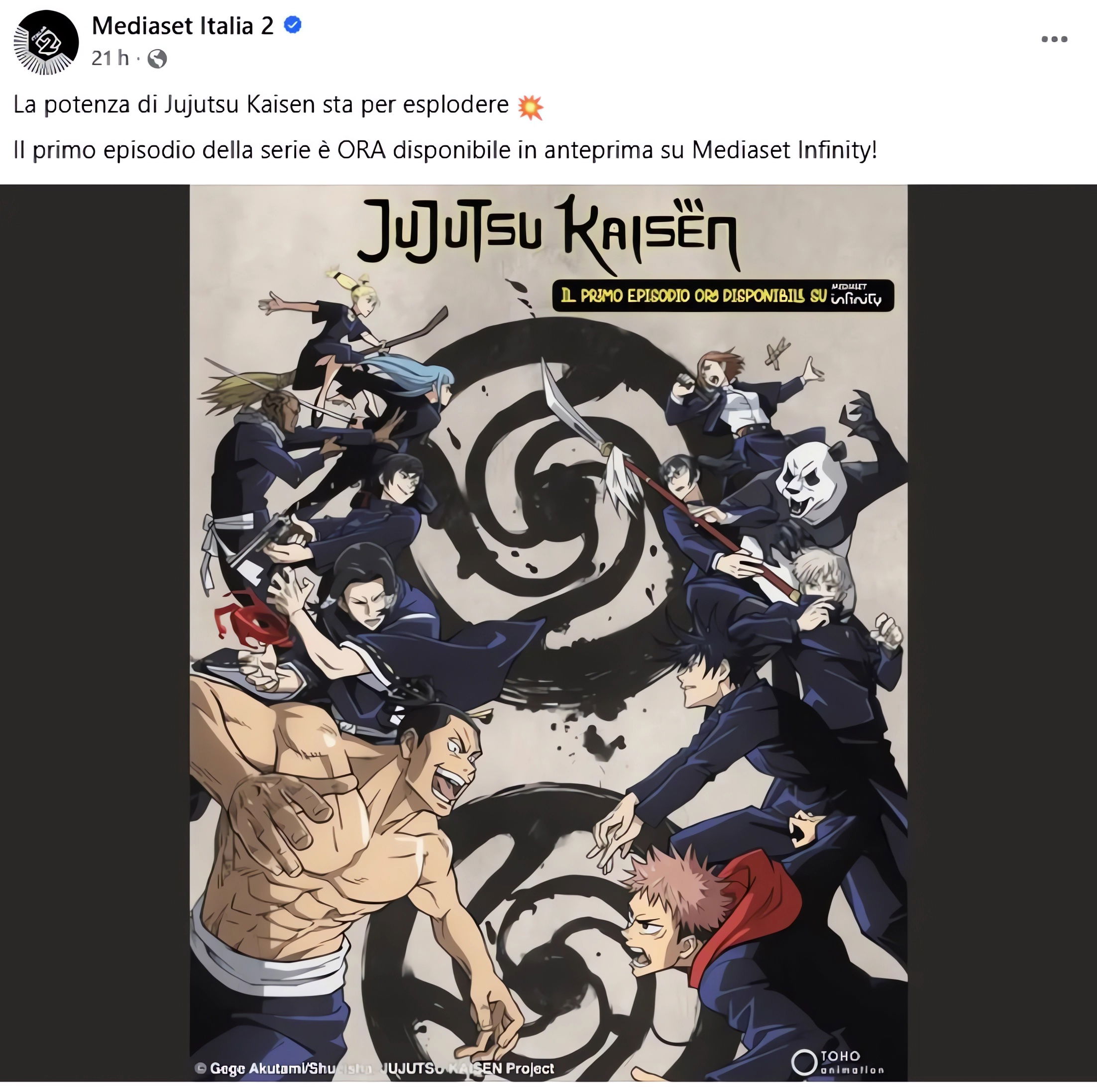 Dal 12 gennaio, Jujutsu Kaisen arriva su Italia 2. Gli episodi andranno in onda tutte le sere alle 21:55, subito dopo One Piece. Se non avete voglia di aspettare, il primo episodio è già su Mediaset Infinity, quindi potete darci un’occhiata subito e tuffarvi nel mondo delle maledizioni.