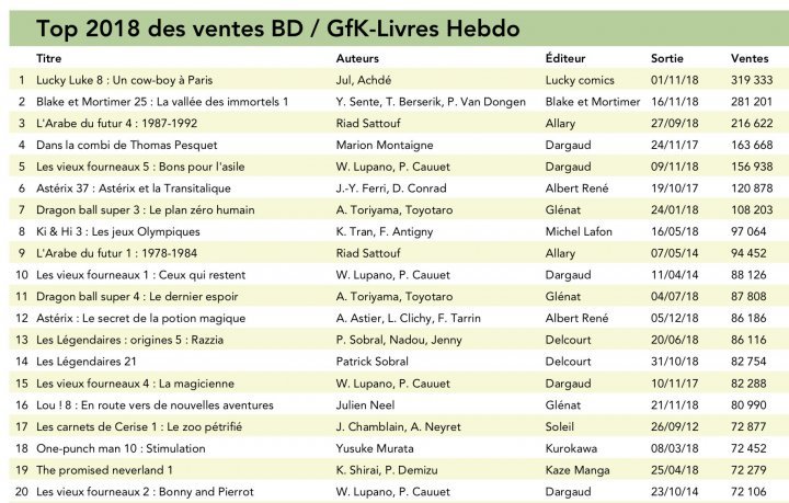 La settimana scorsa abbiamo visto i titoli più venduti, oggi vediamo come se l’è cavata il mercato della BD nel suo insieme: i numeri sono incoraggianti: 44 milioni di album venduti (+ 1 milione rispetto al 2017) e un fatturato di 510 milioni di euro (+ 10 milioni rispetto all’anno precedente) e + 2,5% in volumi, il mercato del fumetto in Francia è aumentato nonostante una “sovraproduzione” che ormai è la regola, la mancanza di un “vero titolo” come Asterix nel 2018 e l’effetto Gilet Gialli durante la stagione delle vacanze.