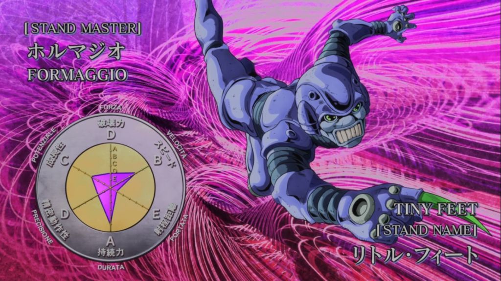 Formaggio sta creando non pochi problemi al nostro Narancia, che si ritrova a dover avere a che fare con un avversario dalle dimensioni mastodontiche rispetto alle sue. Purtroppo per Narancia, però, il fatto che Little Feet sia riuscito a rimpicciolirlo implica anche una notevolissima diminuzione del potere di attacco del suo Aerosmith, anch’esso ridotto quasi ai minimi termini.
