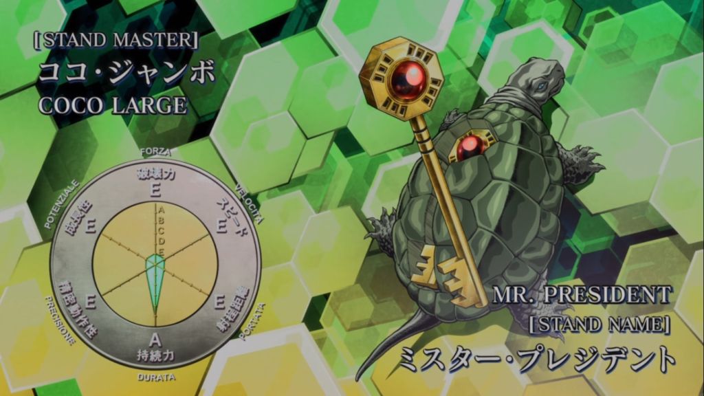Non sappiamo quasi nulla del Boss, ma una cosa è certa: quest’uomo sa il fatto suo. Il mezzo di trasporto sicuro di cui ha parlato a Bucciarati è davvero sicuro come diceva, e può passare piuttosto inosservato: si tratta di Coco Jumbo, una tartaruga Portatrice dello Stand Mr. President, il quale racchiude al suo interno un vero ambiente abitabile (mobili, suppellettili e cibo al suo interno sono assolutamente reali).