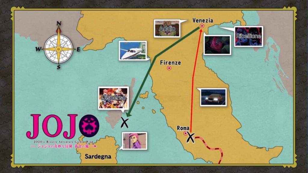 Stando a quanto visto fino a questo momento, la pista fornita da Trish (memore delle parole di sua madre) che ha suggerito a Bucciarati e ai suoi scugnizzi malamente di recarsi in Sardegna per cercare alcune tracce che infine potranno condurli alla scoperta della vera identità del Boss, si sta rivelando decisamente molto, molto valida: se così non fosse, il Boss non avrebbe preso l’importante decisione di occuparsi personalmente di una faccenda così delicata. Inoltre, nella puntata precedente di Vento Aureo (della quale potete trovare qui la mia recensione), lo spietato Portatore del terrificante King Crimson aveva apertamente manifestato particolare ansia al pensiero che non tanto Trish quanto Leone potesse giungere nel luogo specifico mostrato nella fotografia incriminata: se Leone attivasse il suo Mody Blues in quel posto, scoprirebbe che a scattare quella foto fu proprio lui!