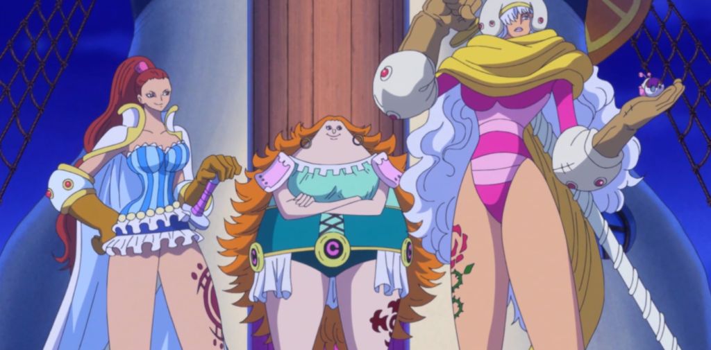 Peros si preoccupa però anche di accerchiare e di sconfiggere definitivamente gli occupanti della Thousand Sunny prima che la nave arrivi sull’Isola Cacao, luogo designato per l’appuntamento con Rufy. A questo scopo, il primogenito di Big Mom decide di affidare il delicato compito di estinguere i Mugiwara a tre delle sue sorelline minori: si tratta, guardando l’immagine qui in alto da sinistra a destra, della sedicesima figlia di Big Mom, Cinnamon, di Citron, quindicesima figlia, e della più temibile fra le tre: Smoothie, quattordicesima figlia di Big Mom, nonché uno dei tre Generali Sweet.
