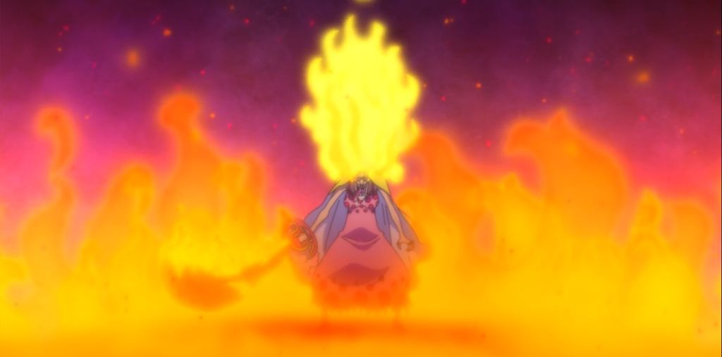 Il potere di questa già enorme donna le consente di scagliare una serie di attacchi resi ancor più devastanti proprio dalla sua dimensione, che aumenta semplicemente nutrendosi dei liquidi contenuti nei corpi di altri esseri umani, che in questo caso specifico sono i suoi stessi sottoposti. I Mugiwara non possono e non devono sfuggirle, e in guerra, come si suol dire, il fine giustifica i mezzi: non esiste un sacrificio abbastanza grande da non essere compiuto, se l’obiettivo è disfarsi definitivamente di quei pirati scellerati che hanno osato penetrare nei territori dell’Imperatrice Big Mom, interrompere il Tea Party e distruggere la torta nuziale per riportare indietro con loro lo sposo, il cuoco di bordo Sanji Vinsmoke.