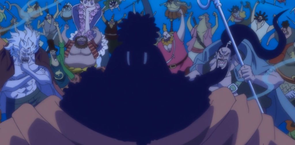 Come ho già accennato in precedenza, una improvvisa imboscata da parte della ciurma di figli/pirati di Big Mom rischierà di affondare una volta per tutte la Thousand Sunny. Ma negli ultimi minuti dell’episodio, finalmente farà la sua comparsa la ciurma alla quale si fa esplicito riferimento nel titolo della puntata stessa: anche se Jinbe ha deciso di entrare a far parte della ciurma di Cappello di Paglia, mantenendo così fede alla promessa fatta a Rufy nella sua madre patria, l’Isola degli Uomini Pesce, i suoi sottoposti, i Pirati del Sole, non hanno certo intenzione di abbandonare il loro ex Capitano a morte certa: per questo, sono tornati a dargli man forte un’ultima volta, prima che le loro strade si dividano forse per sempre. Riusciranno le forze dell’Intesa ad avere finalmente la meglio su quelle dell’Alleanza e a lasciare indenni le acque territoriali appartenenti ai domini di Big Mom?