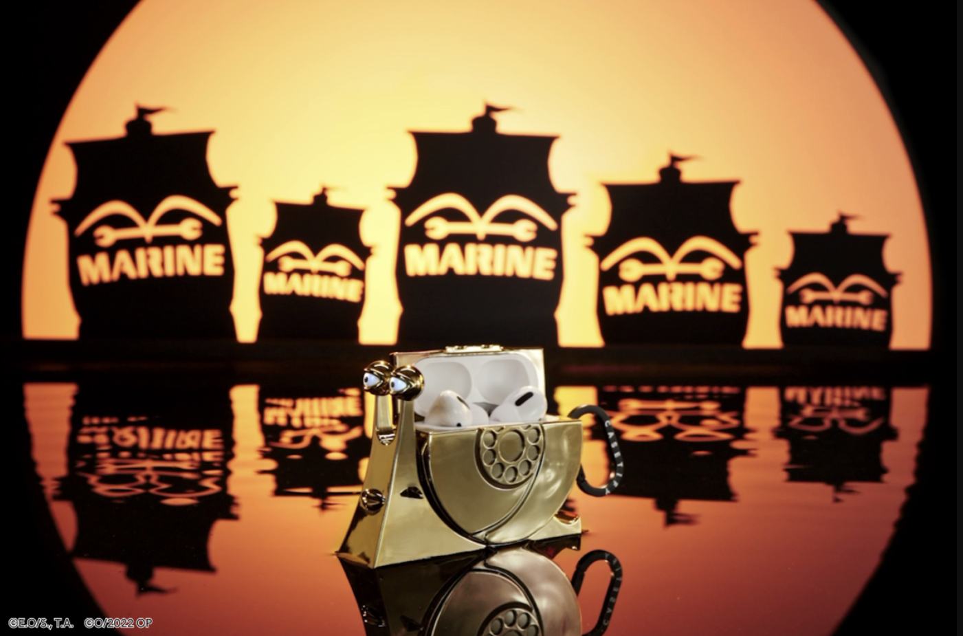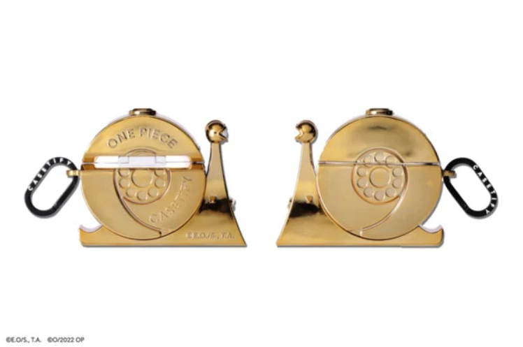 L’oggetto più unico della collezione è la custodia Golden Transponder Snail 3D AirPods Pro, che si basa sui dispositivi di comunicazione noti come lumacofoni (Den Den Mushi), utilizzati dagli ammiragli della marina per evocare l’attacco Buster Call e non solo. Il guscio e il corpo della custodia sono rimovibili, il che ti consente di trasportare solo il guscio per comodità.
