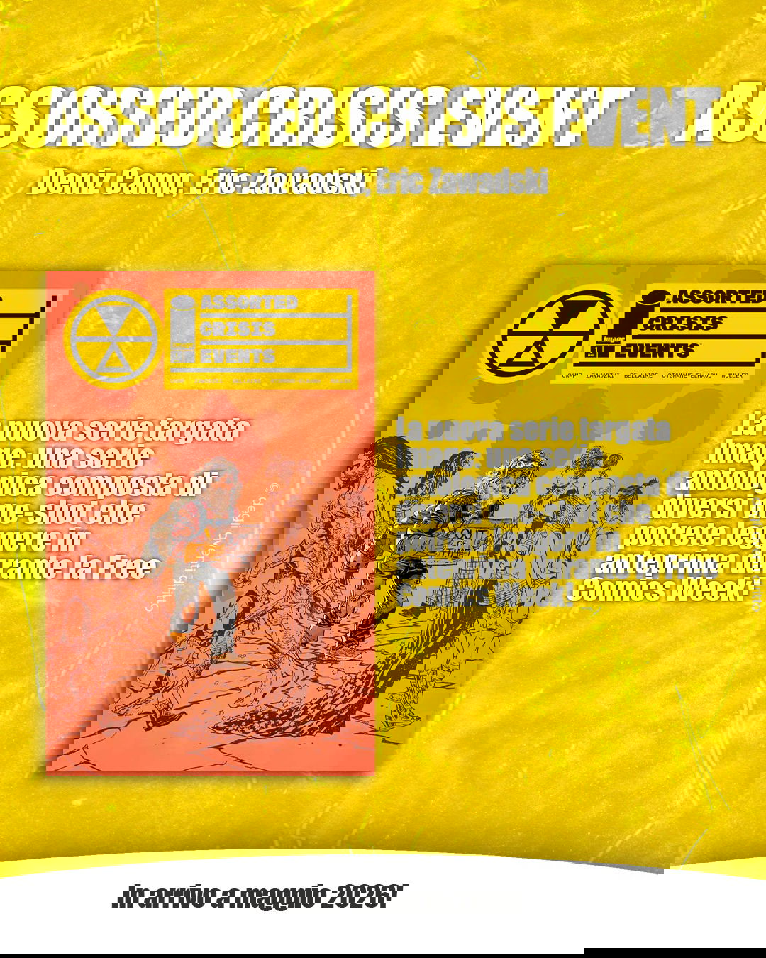 Si parte con Assorted Crisis Event di Deniz Camp ed Eric Zawadski, una serie antologica firmata Image Comics composta da diversi one-shot, che sarà possibile leggere in anteprima durante la Free Comics Week. A seguire troviamo Il teschio venuto dalla Svezia di Daria Schmitt, un’opera poetica e surreale in cui il cranio del filosofo Cartesio prende vita, affrontando un viaggio tra scheletri e reliquie animali per riscoprire sé stesso.