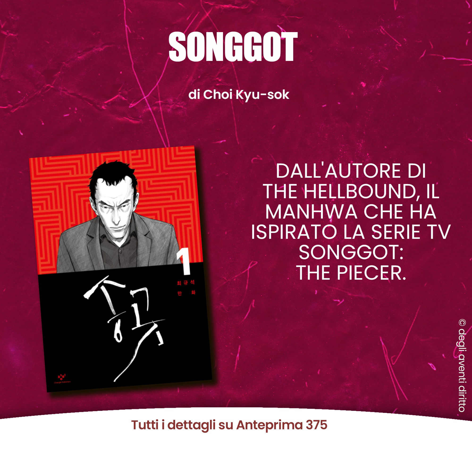Si tratta di un manhwa che ha ispirato la serie TV Songgot: The Piercer. L’autore di Songgot è Choi-Kyu-Sok, già noto tra i lettori italiani per aver realizzato The Hellbound. Quest’ultimo è caratterizzato da due adrenalinici volumi ricchi di mistero e il brivido.