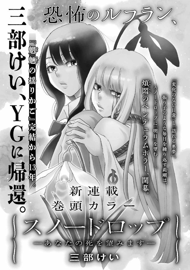 Chi ha amato Erased sa che Sanbe Kei sa come catturare il lettore con tensione, mistero e colpi di scena che restano impressi a lungo. Ora il mangaka è pronto a tornare, ma questa volta con un progetto che promette di portare i suoi fan in territori ancora più oscuri: il nuovo horror Snow Drop – I Wish For Your Death, in arrivo sul numero 22/2025 di Young Gangan, in uscita il 7 novembre.