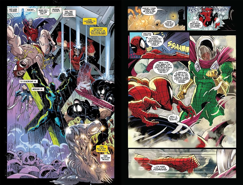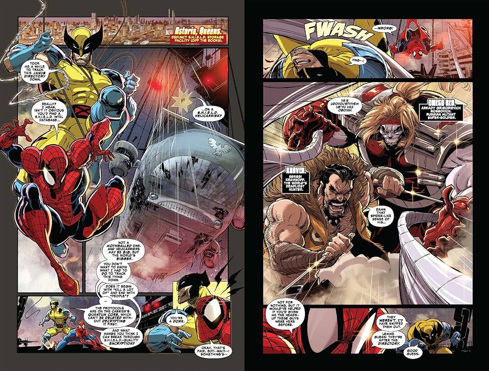 Una volta che riusciranno a rintracciarlo all’interno di un vecchio elivelivolo S.H.I.E.L.D. si innescheranno una serie di eventi a catena, che li porteranno prima ad affrontare loro storici avversari, come Omega Red, Kraven il Cacciatore e Mysterio, e poi scontrarsi in maniera selvaggia tra di loro, dopo aver scoperto alcuni retroscena riguardo il passato di Logan e quello dei genitori di Peter Parker, che come i fan di lunga data sapranno, erano proprio degli agenti segreti, morti tragicamente in un incidente aereo.