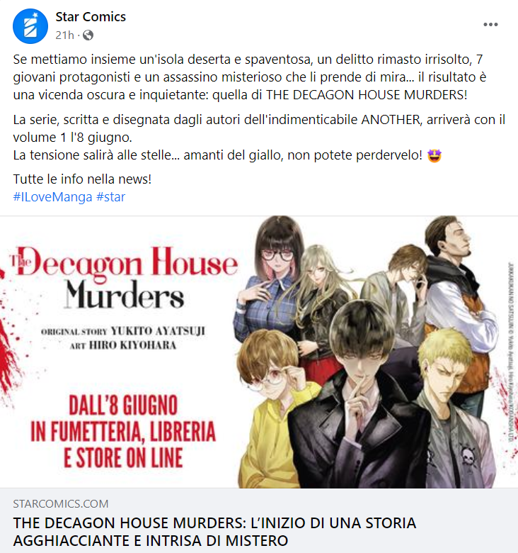 Come riporta direttamente la pagina Facebook ufficiale della casa editrice italiana Star Comics, arriva in Italia The Decagon House Murders.