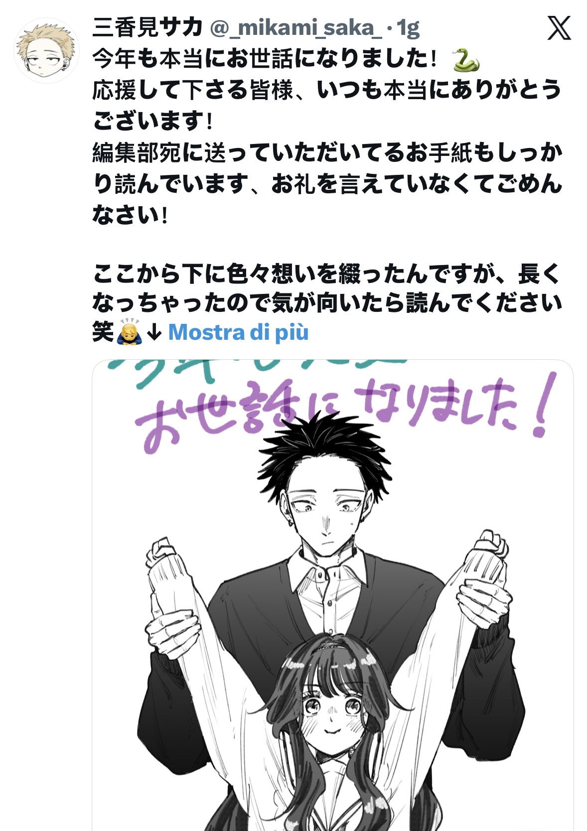 Nel suo post, Saka ringrazia prima di tutto i lettori che l’hanno sostenuta, spiegando quanto il 2025 sia stato un anno speciale per lei. L’arrivo dell’anime ha permesso a tantissime nuove persone di scoprire Kaoru Hana, e l’autrice racconta con grande emozione il momento della festa dedicata alla serie, quando si è trovata davanti a una folla enorme e l’emozione le ha fatto letteralmente tremare le gambe. Un ricordo che descrive come uno dei più preziosi della sua vita.