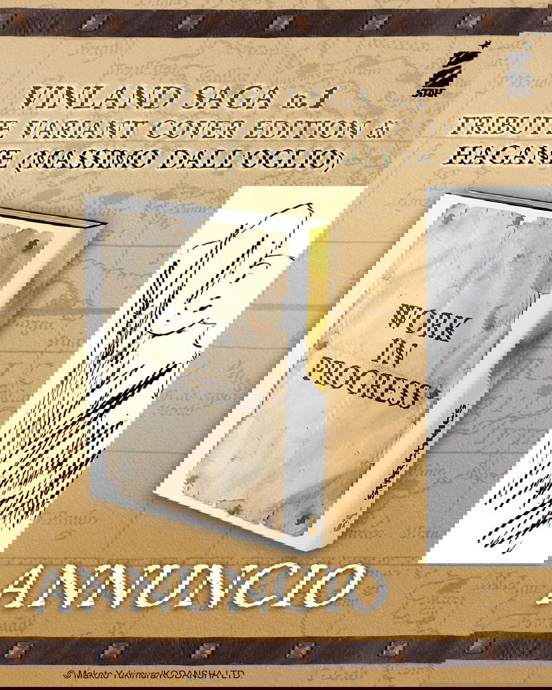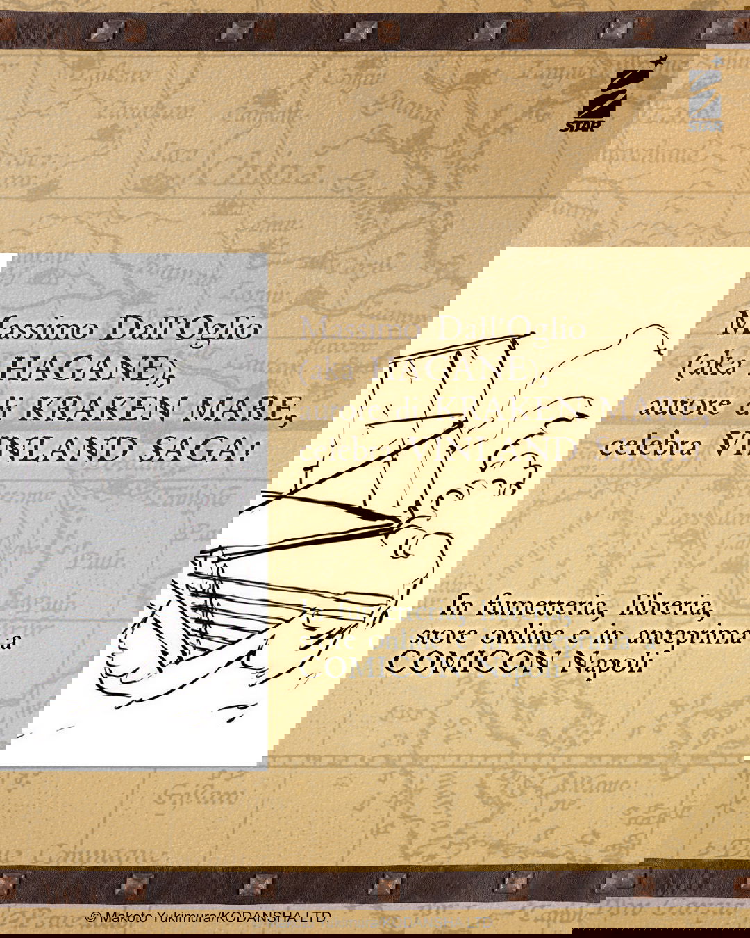 Il secondo annuncio guarda invece al lato più artistico e celebrativo. Sempre dal 5 maggio arriverà la Vinland Saga n.1 Star Tribute Variant Cover Edition, firmata da HAGANE (Massimo Dall’Oglio), autore di Kraken Mare. Una variant nata come omaggio alla serie e all’arrivo di Yukimura al COMICON Napoli, pensata per chi ama collezionare edizioni speciali e reinterpretazioni d’autore. Sarà disponibile in fumetteria, libreria, store online e ovviamente in anteprima in fiera.