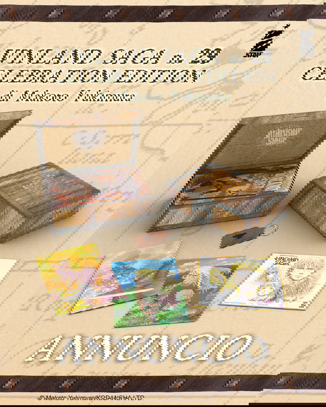 Il gran finale è affidato al terzo annuncio: Vinland Saga n.29 Celebration Edition. Qui si parla di un’edizione da collezione vera e propria, con cofanetto dedicato, il volume celebrativo della serie e una serie di gadget pensati per i fan. All’interno ci sarà anche lo storyboard dell’ultimo capitolo di Vinland Saga, un dettaglio che da solo vale l’acquisto. Completano il tutto un portachiavi in ecopelle, un mini-shikishi celebrativo e due mini-litografie.